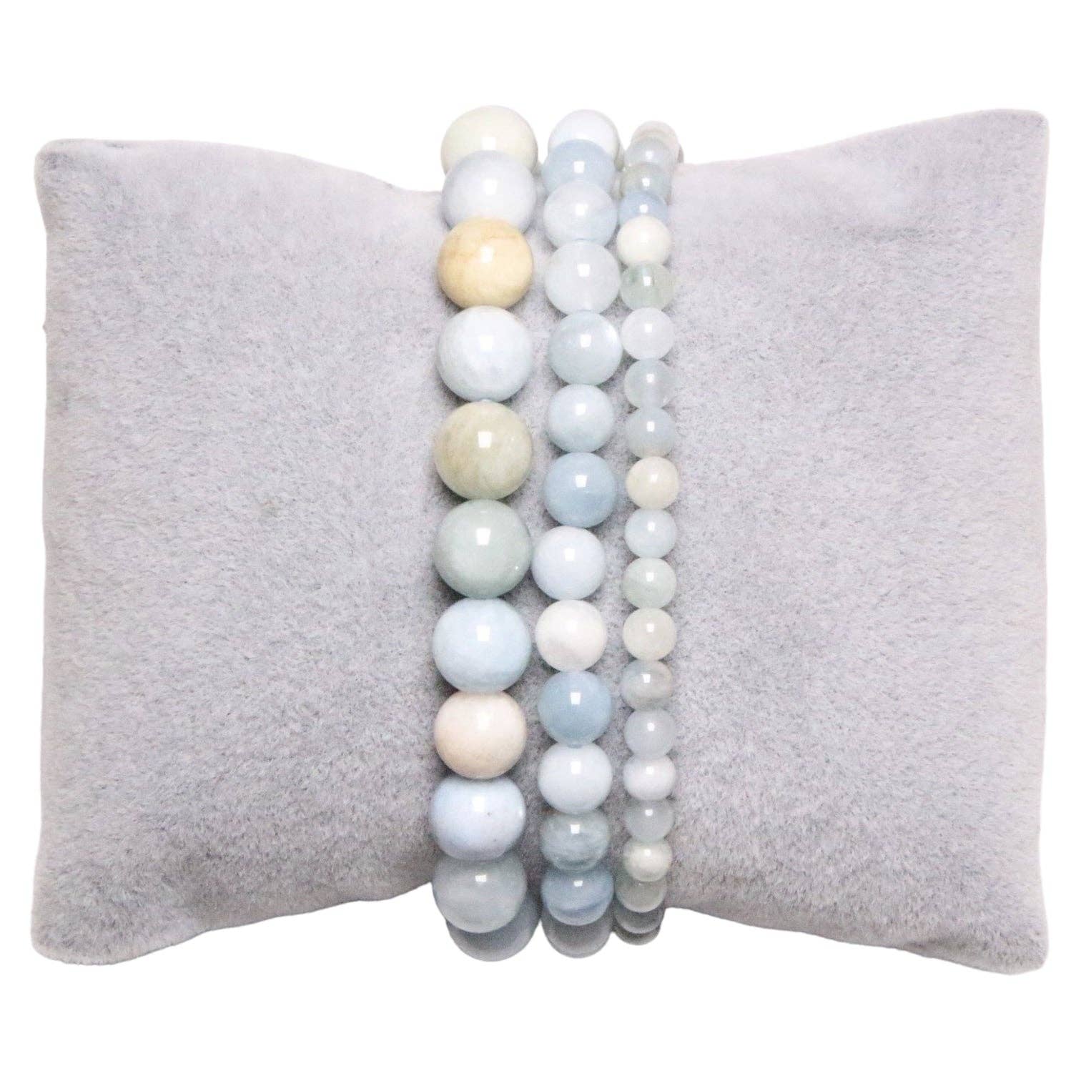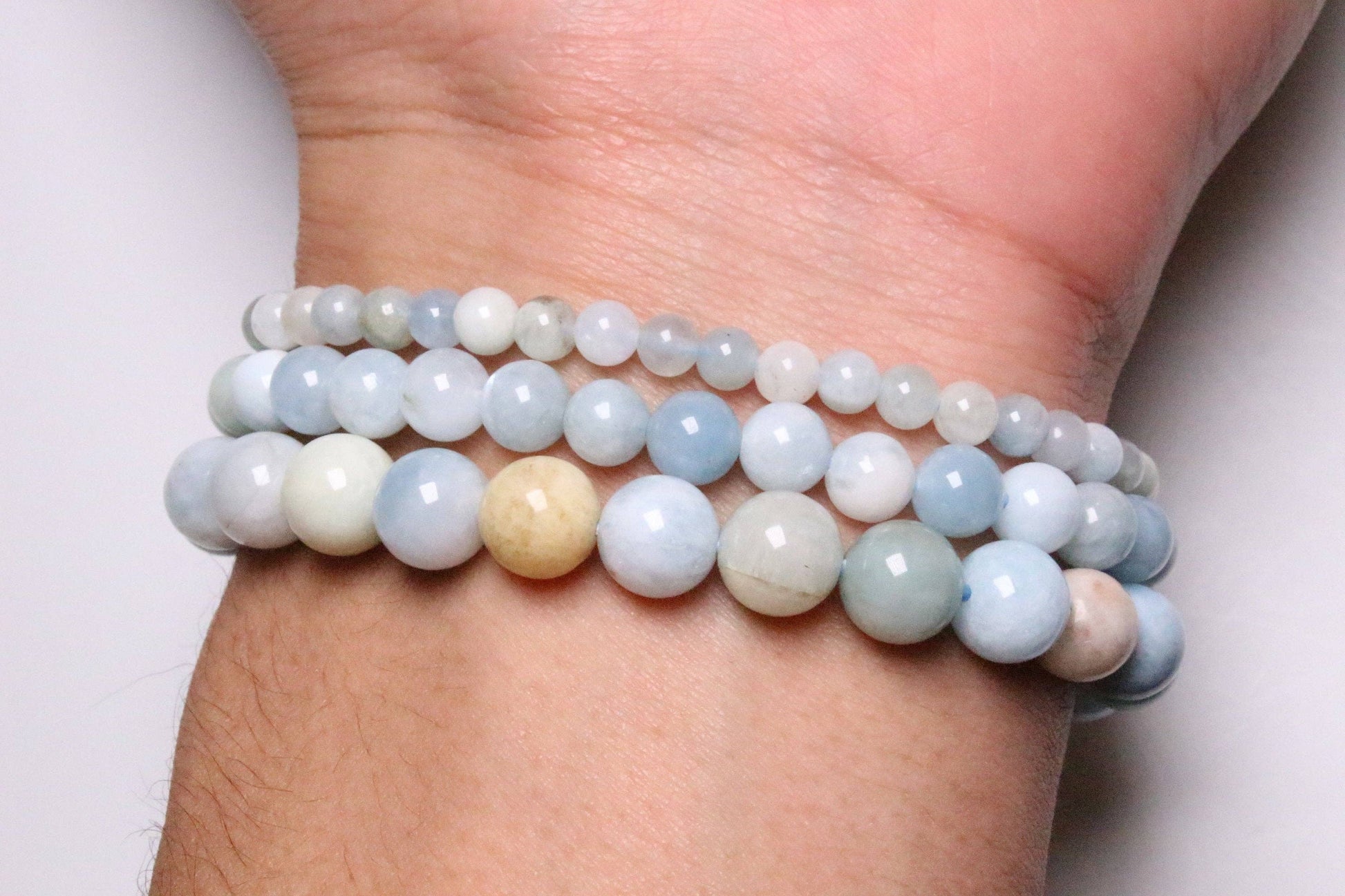 Dette armbånd er håndlavet af naturlig flerfarvet akvamarin, som kendes for sine bløde nuancer af blå, mint, grå og let rosa. Hver perle er poleret for at fremhæve stenens fine glød og giver armbåndet et let, roligt og harmonisk udtryk.
