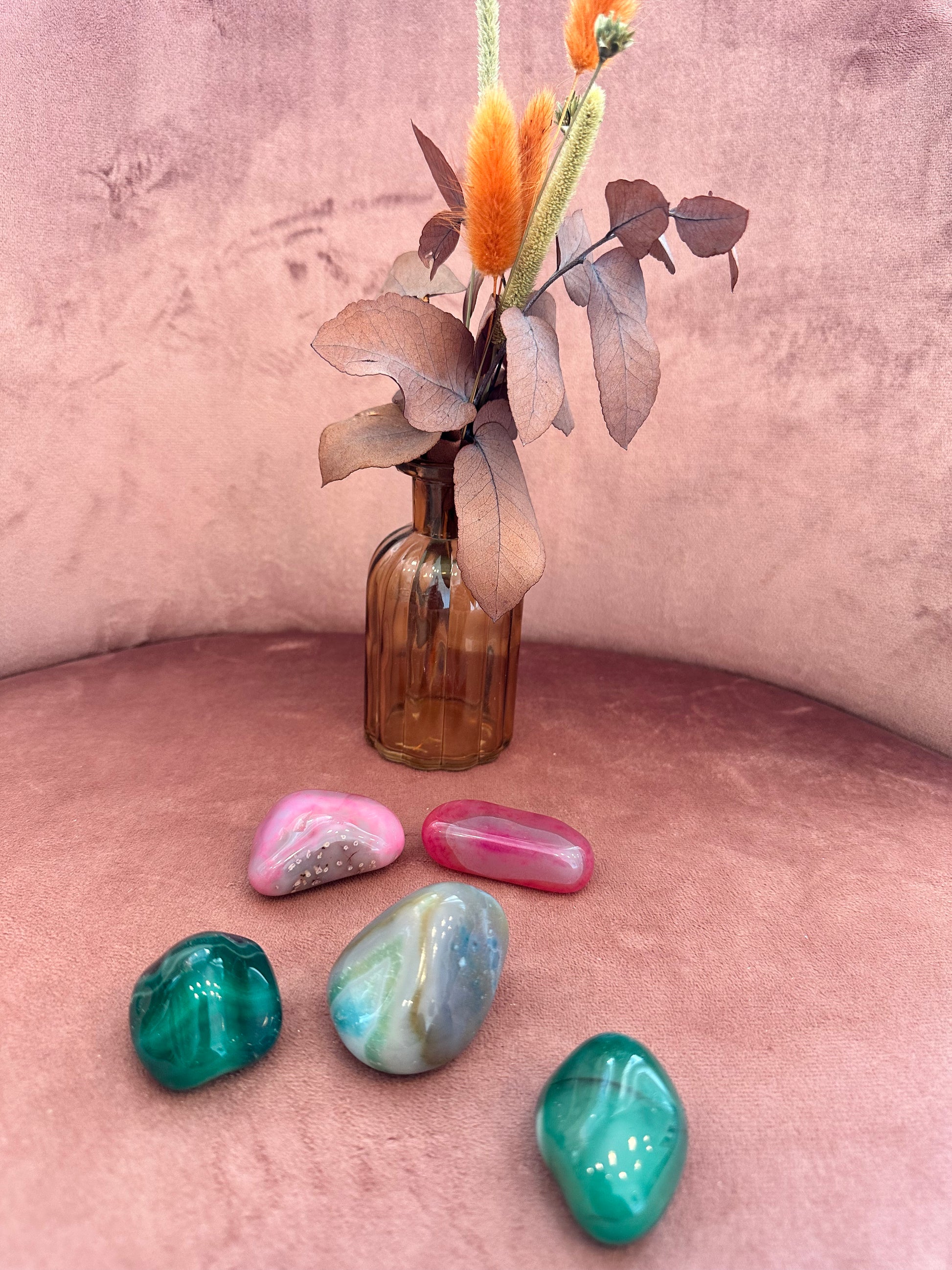 Arbejd med Agat, når du ønsker at bringe stabilitet og harmoni ind i dit liv. Agat findes i mange forskellige farver, og ligesom eksempelvis Fluorit eller Calcit, så har de grundlæggende fælles energier, hvor de forskellige farver kan bruges til forskellige faser igennem livet. ⠀⠀⠀