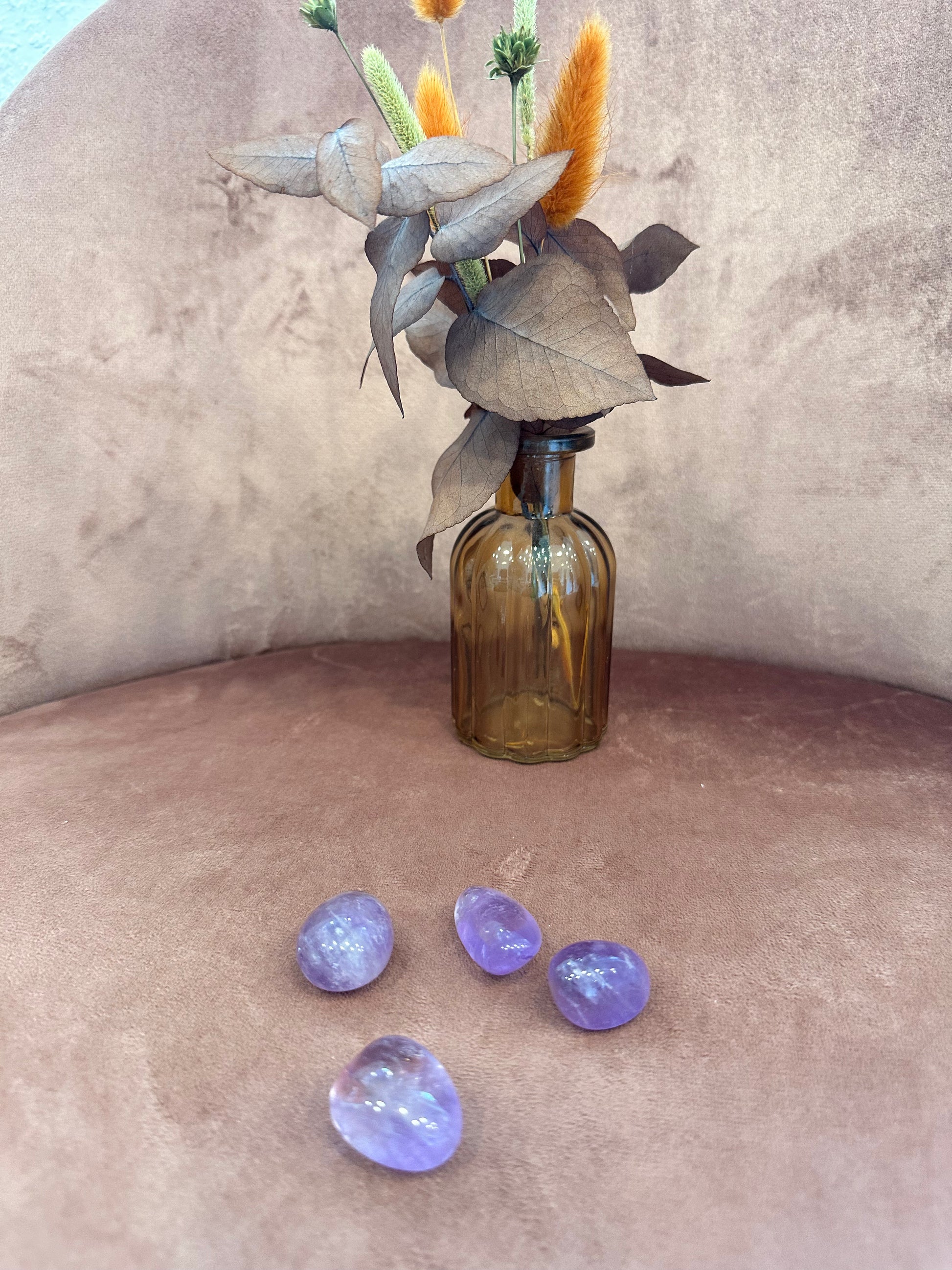 De smukke poleret ametyst er er perfekte til at have i lommen, have med i tasken eller som nogen gør, ligger den i BHén