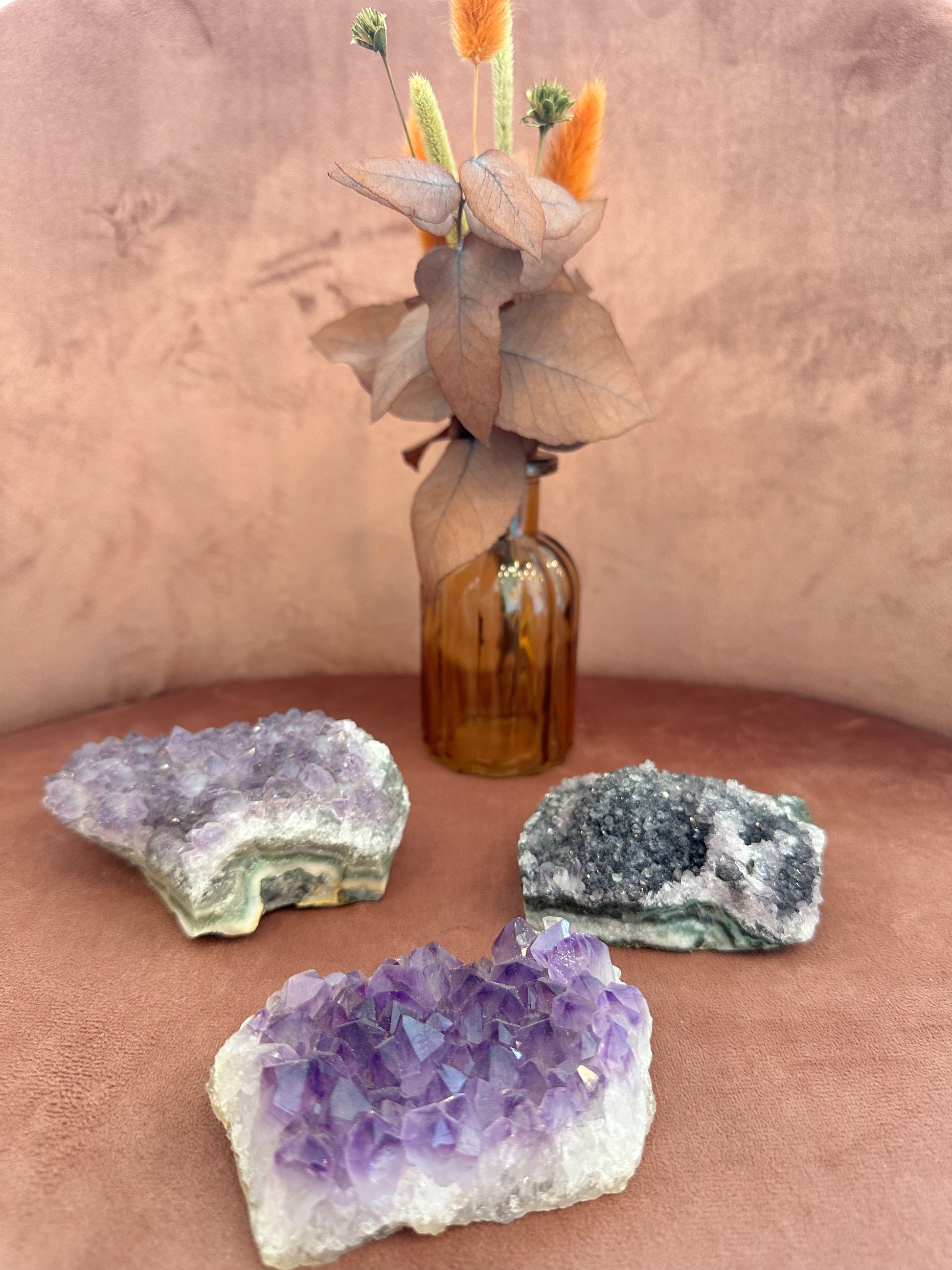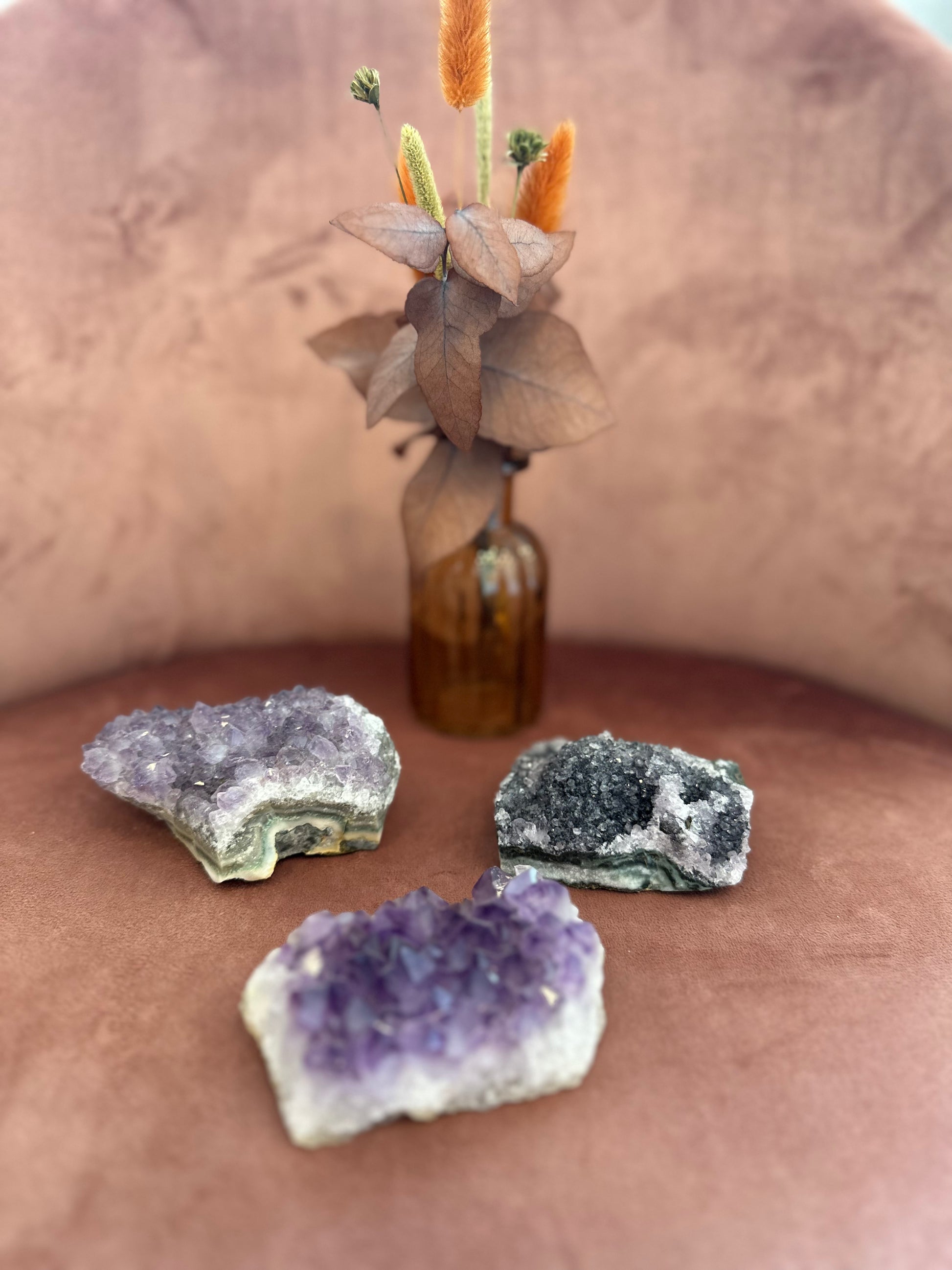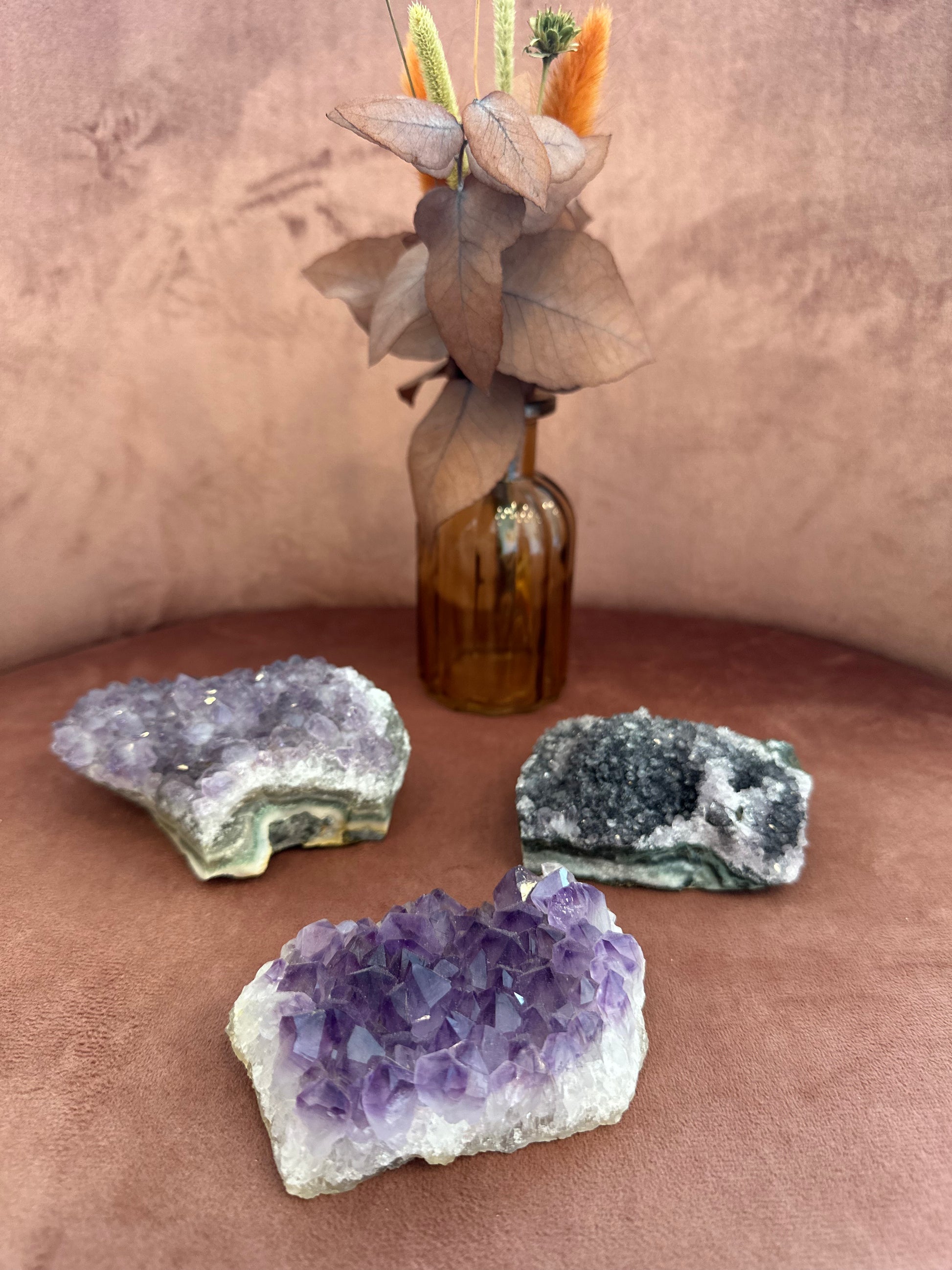 Ametyst vil sammen med Bjergkrystal, rosenkvarts & Selenit, vibrerer med energier, der vil gavne alle hjem. De kan placeres rundt omkring i dit hjem, for at bringe kærlighed, lys,heale og højne energierne