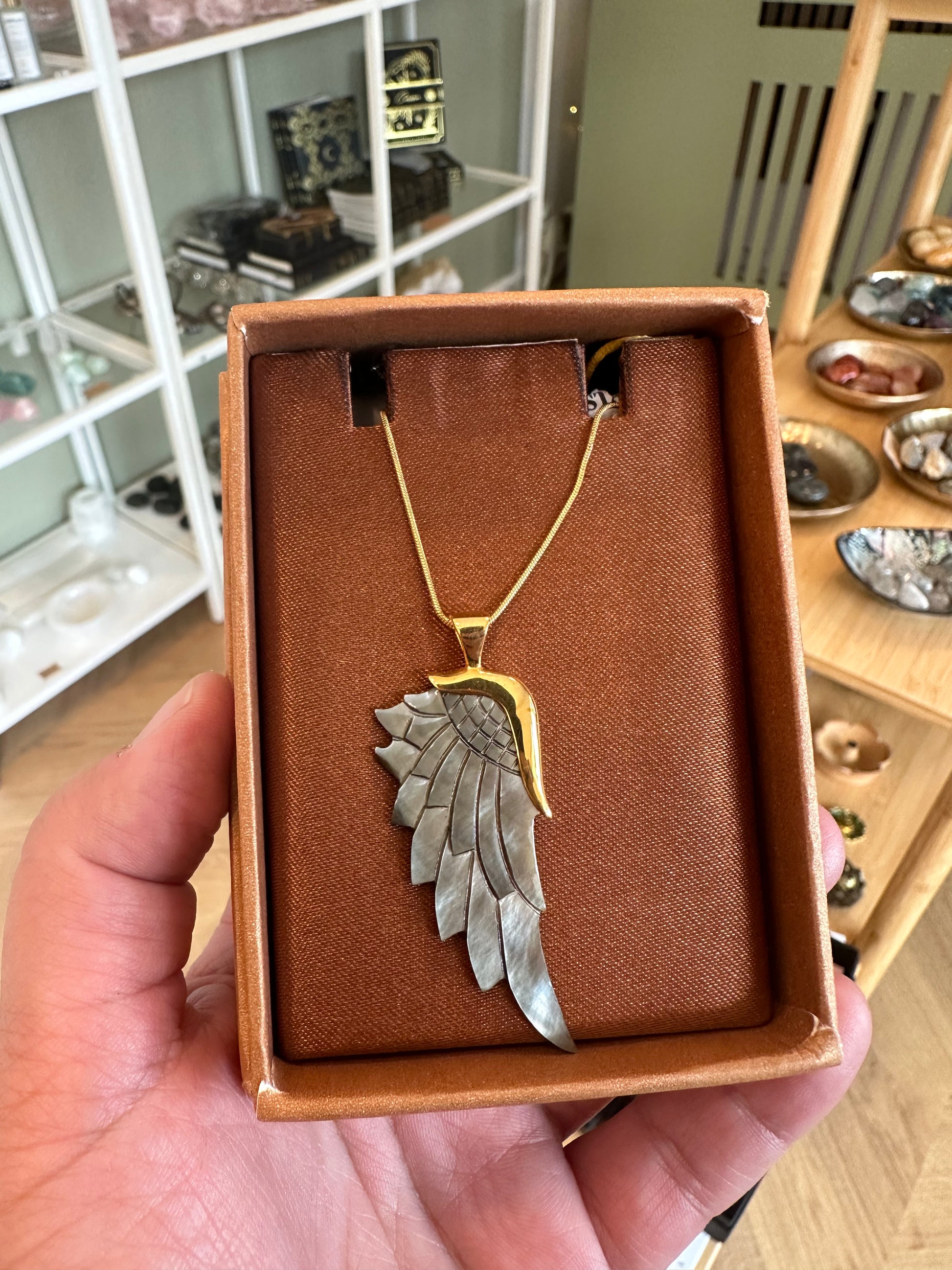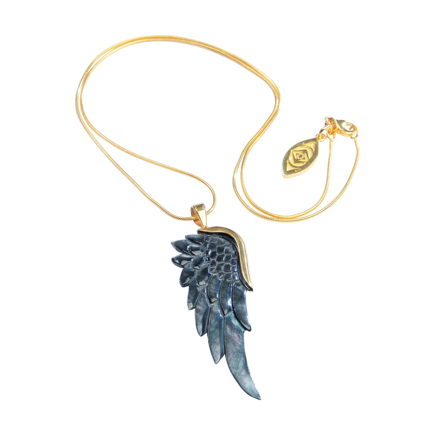 This Angelica necklace is our gunmetal ‘mother of pearl’ pendant. The shell wing pendant is hand carved for 5 hours, set in brass, and dipped in 24 karat gold. This classic everyday piece is finished with a sterling silver snake chain, dipped in gold. Worn day or night. Layer it or let it shine on its own.