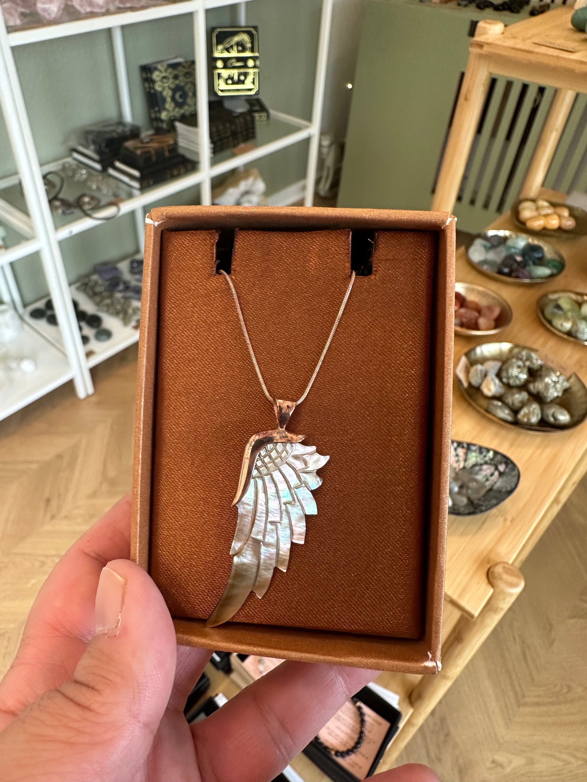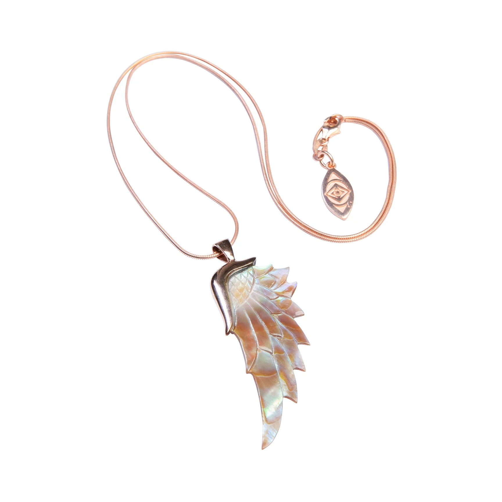 This Opal wonder rose necklace is our signature opal ‘mother of pearl’ pendant! This shell wing pendant is hand carved for 5 hours, set in sterling silver and dipped in 3 micron rose gold. This best selling piece is finished with a sterling silver snake chain, then dipped in rose gold. Worn day or night. Layer it or let it shine on its own.