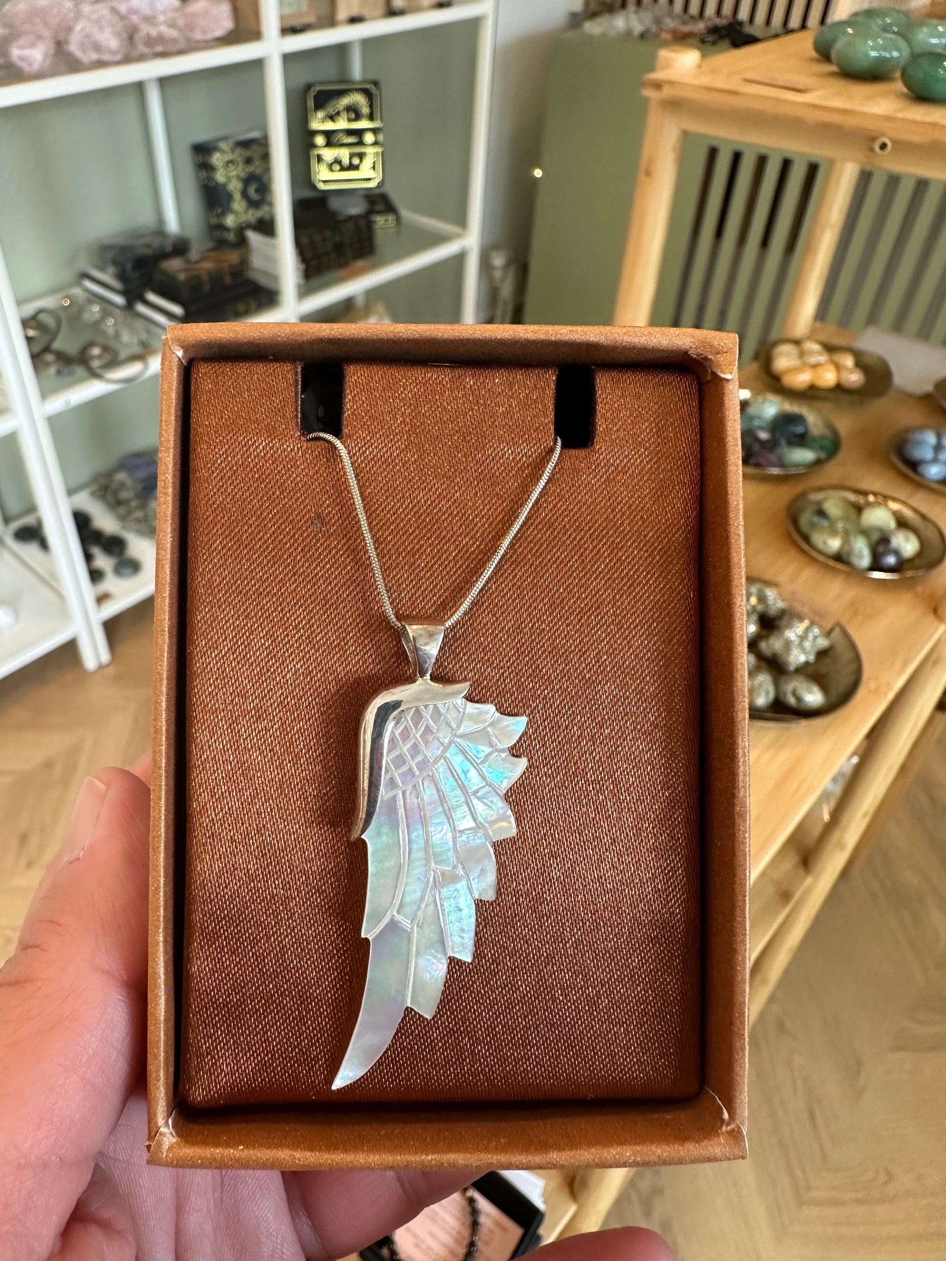 Halskæden bærer det smukke elfenbenshvide englevinge vedhæng af perlemor fra Abeloneskallen.