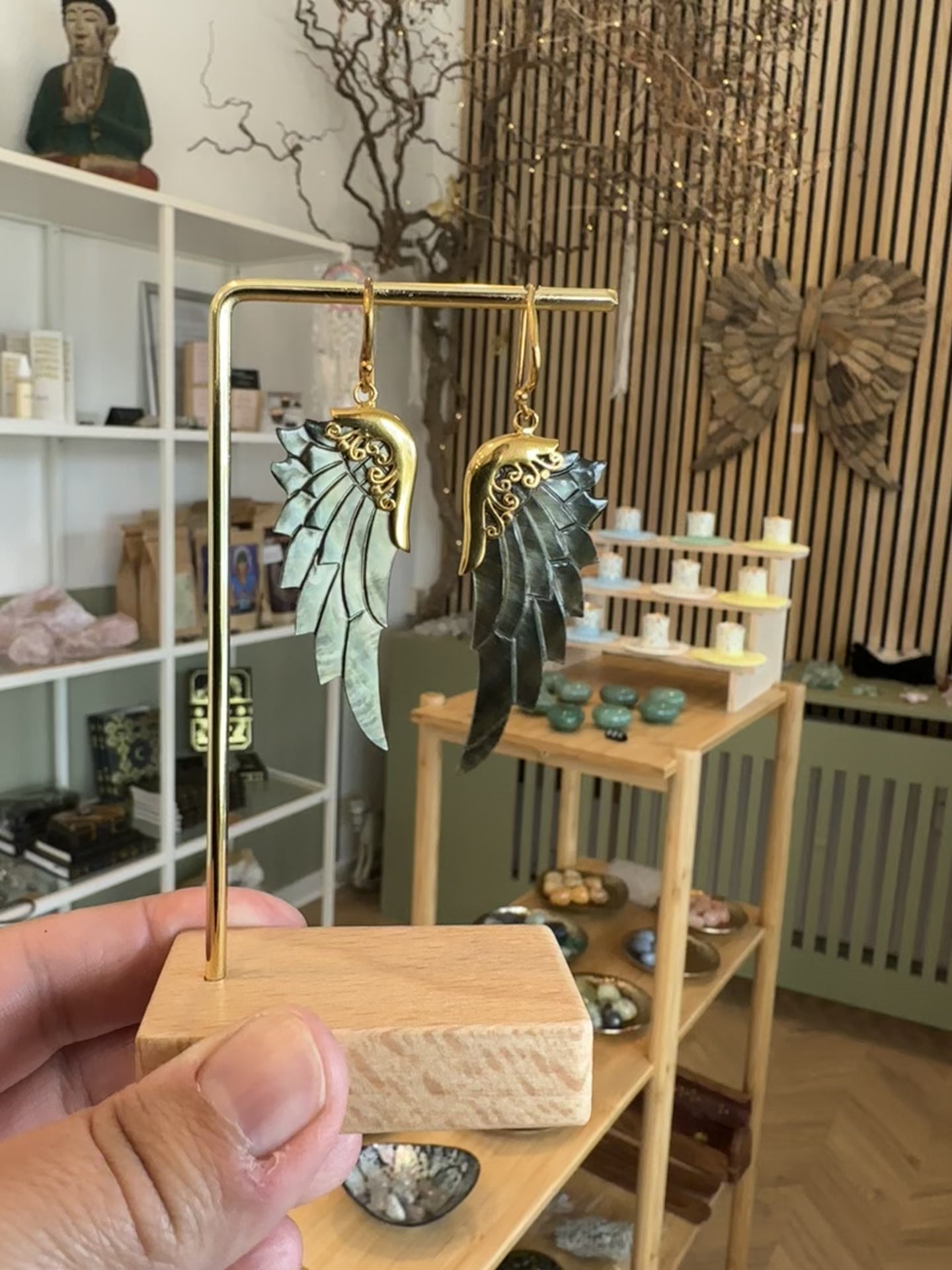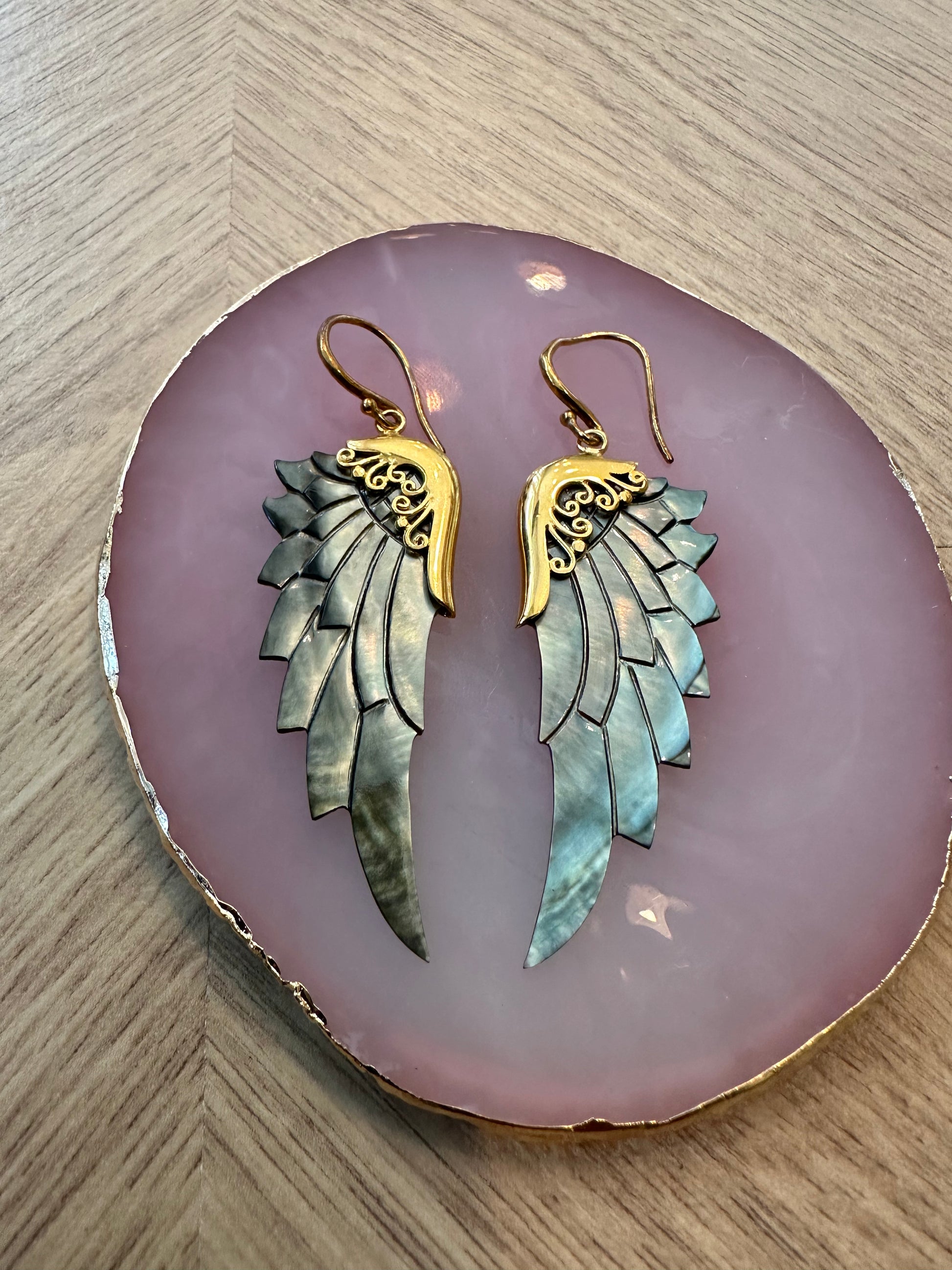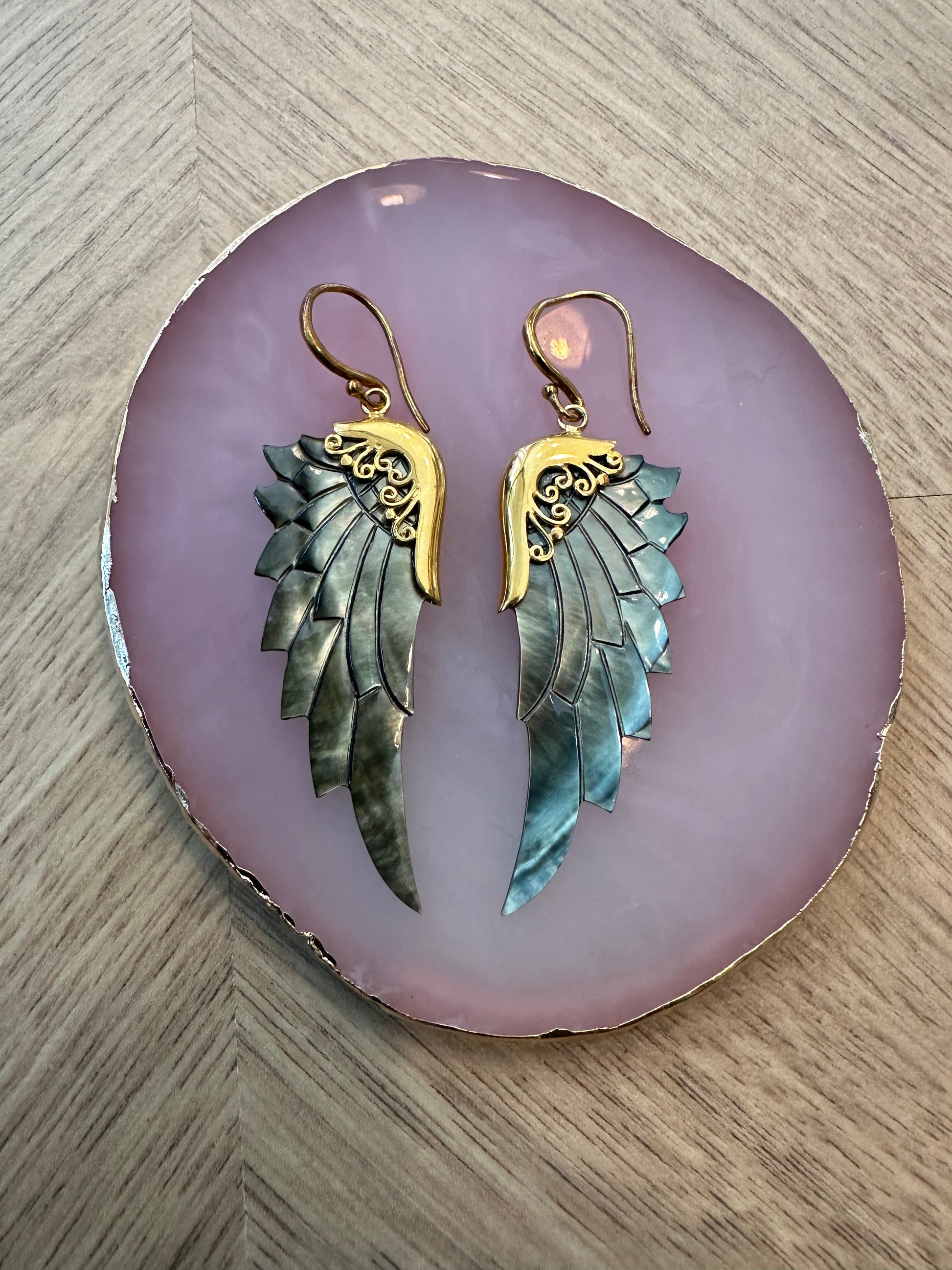 Disse bæredygtigt fremskaffede abaloneskaller øreringe er håndskåret i over 8 timer, udstyret med messingdetaljer og dyppet i 24 karat guld med en ekstra nano-coating for beskyttelse.