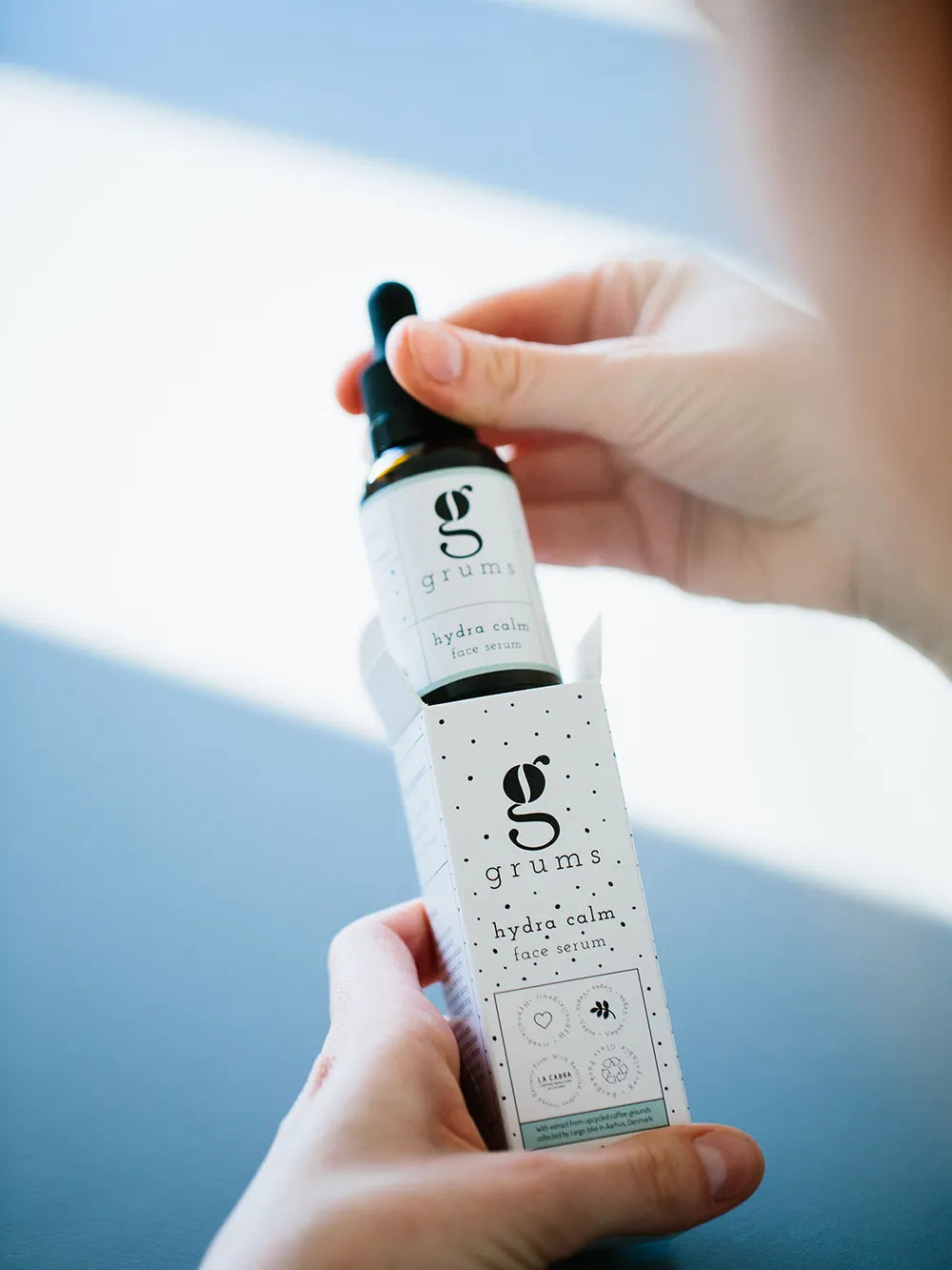 Grums hydra calm face serum er idéel til både tør og sensitiv hud, hvor den bidrager til at øge hudens fugtniveau og styrker hudbarrieren, hvorfor den kan anbefales til behandling af tør og sensitiv, samt behandling og forebyggelse af fine linjer grundet fugtmangel.