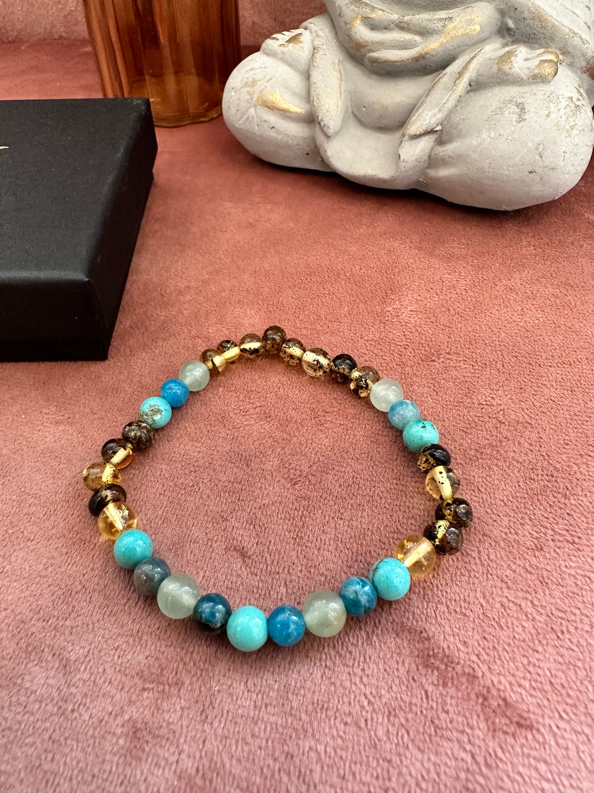 Dette smykke er lavet af Aventurin, Citrin, Turkis, Jade, Apatit & grøn Rav.