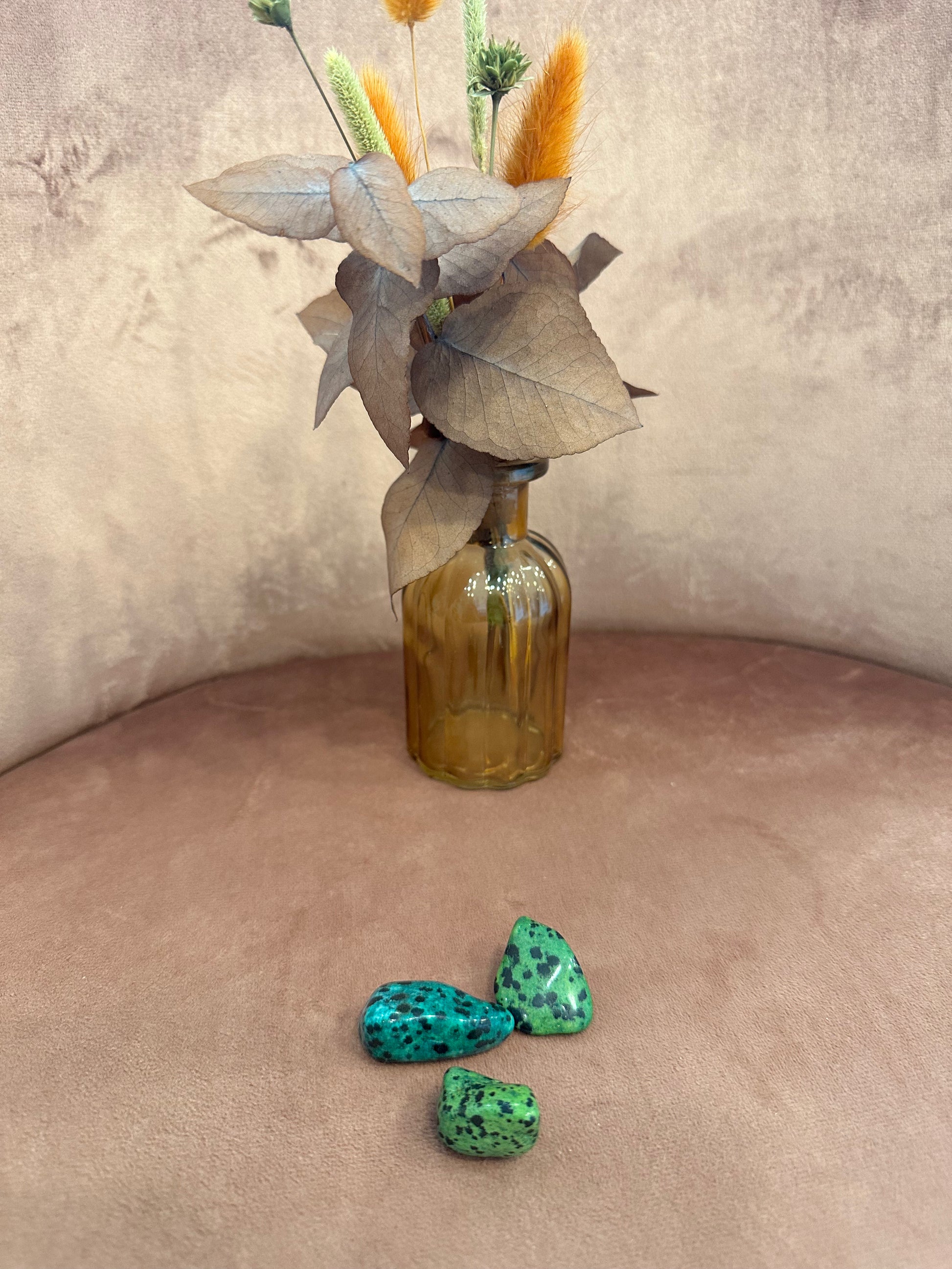 En grøn dalmantiner jaspis er en beskyttende og helbredende sten, som modvirker kynisme og skepsis og styrker familien, langsigtede venskaber.