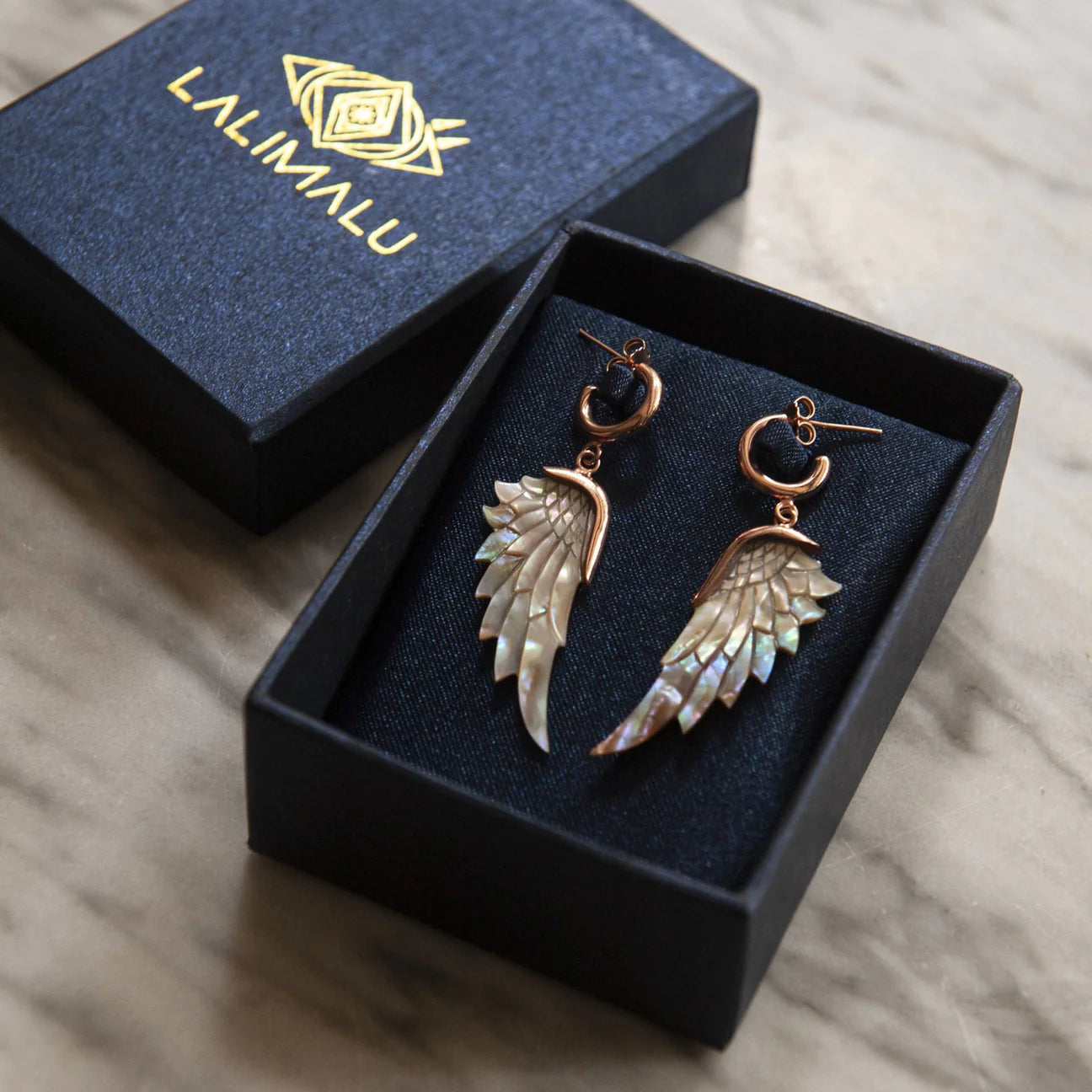 Englevingerne er håndudskåret i over 7 timer ved hjælp af bæredygtigt fremskaffet abaloneskal fra en perlefarm på Bali.