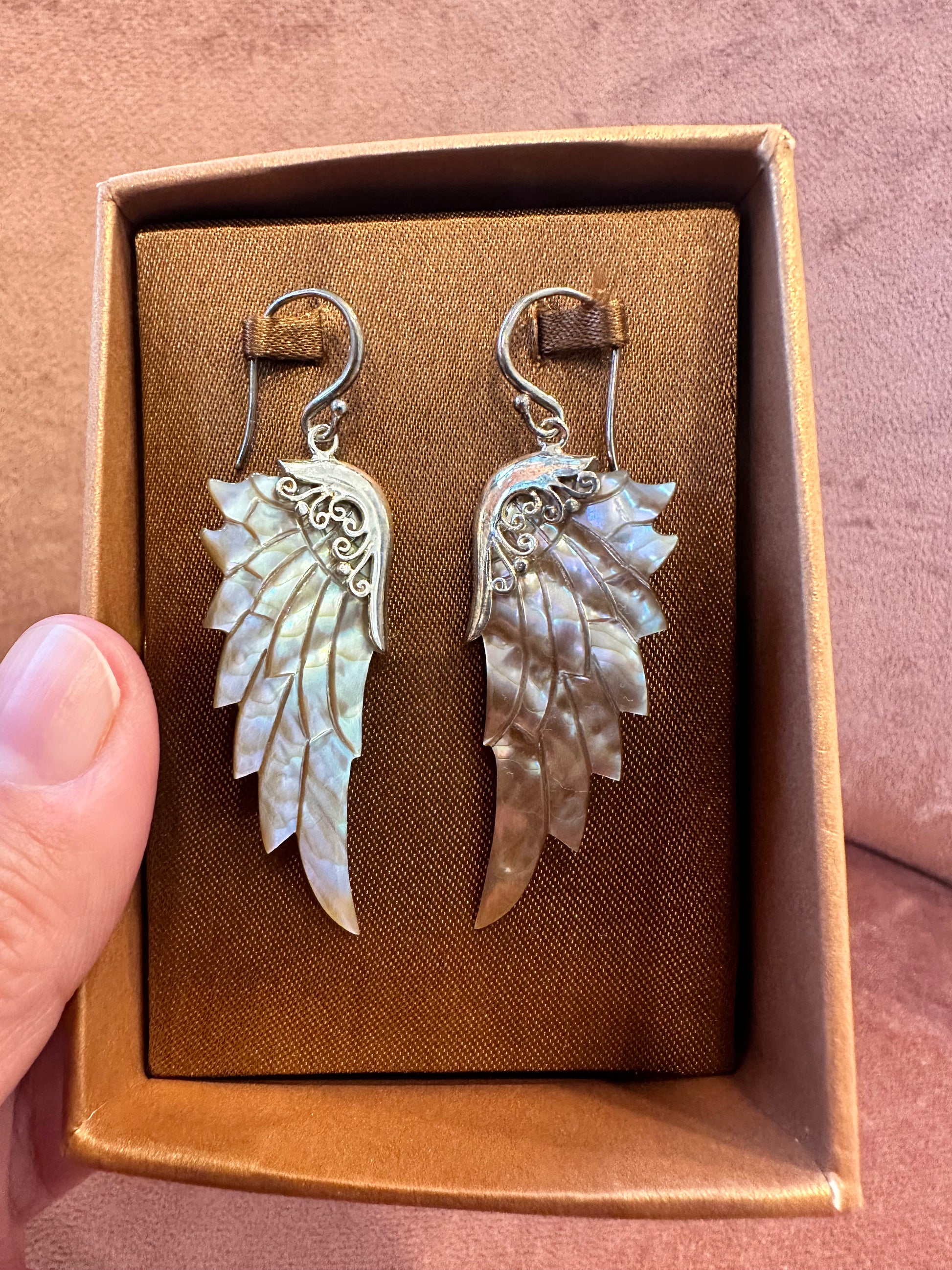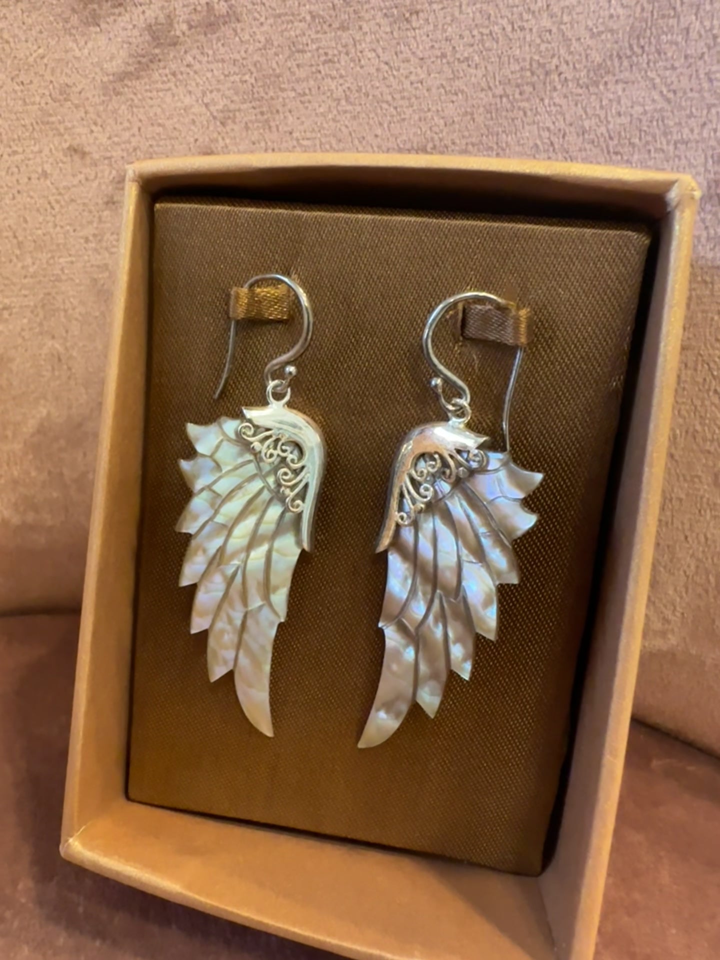 Disse bæredygtige abalone shell øreringe er håndskåret i over 8 timer og udstyret med sterling sølv detaljer.