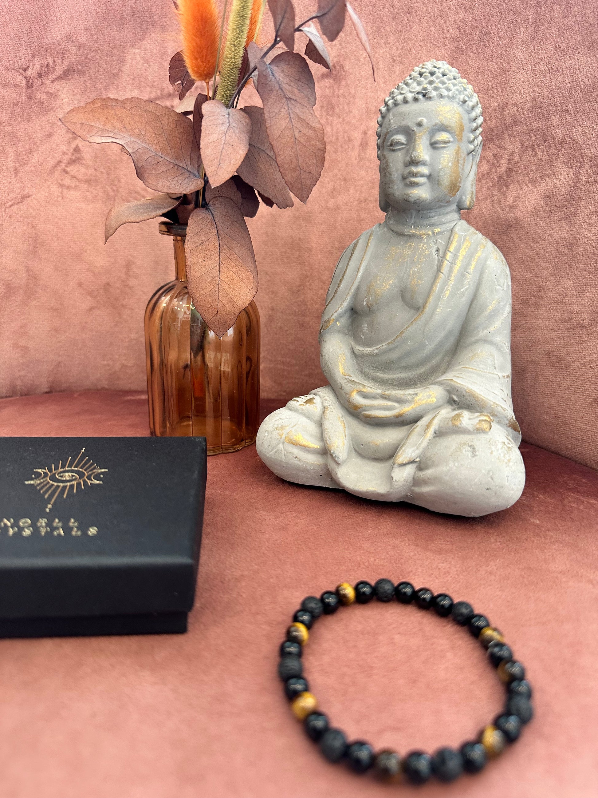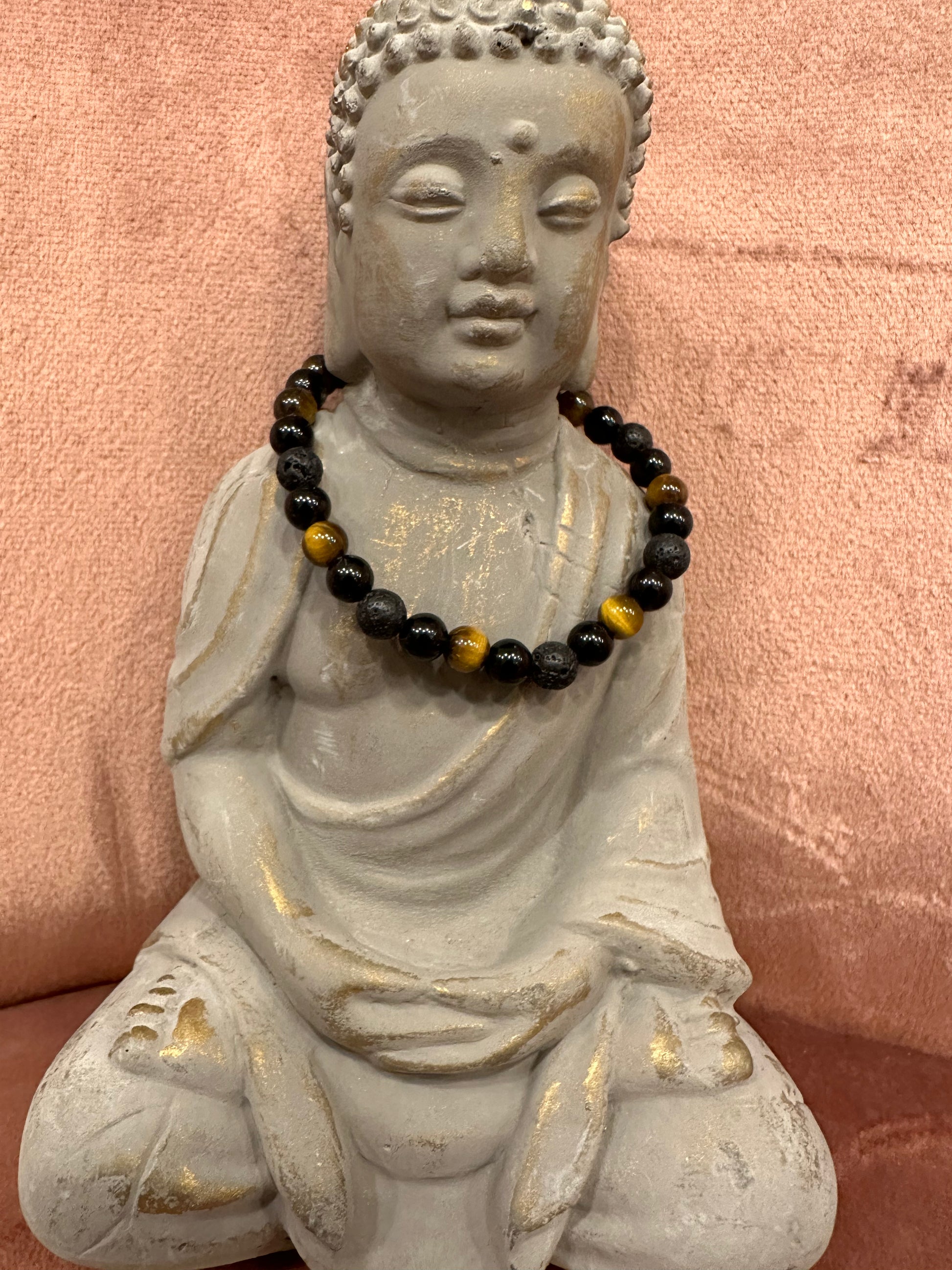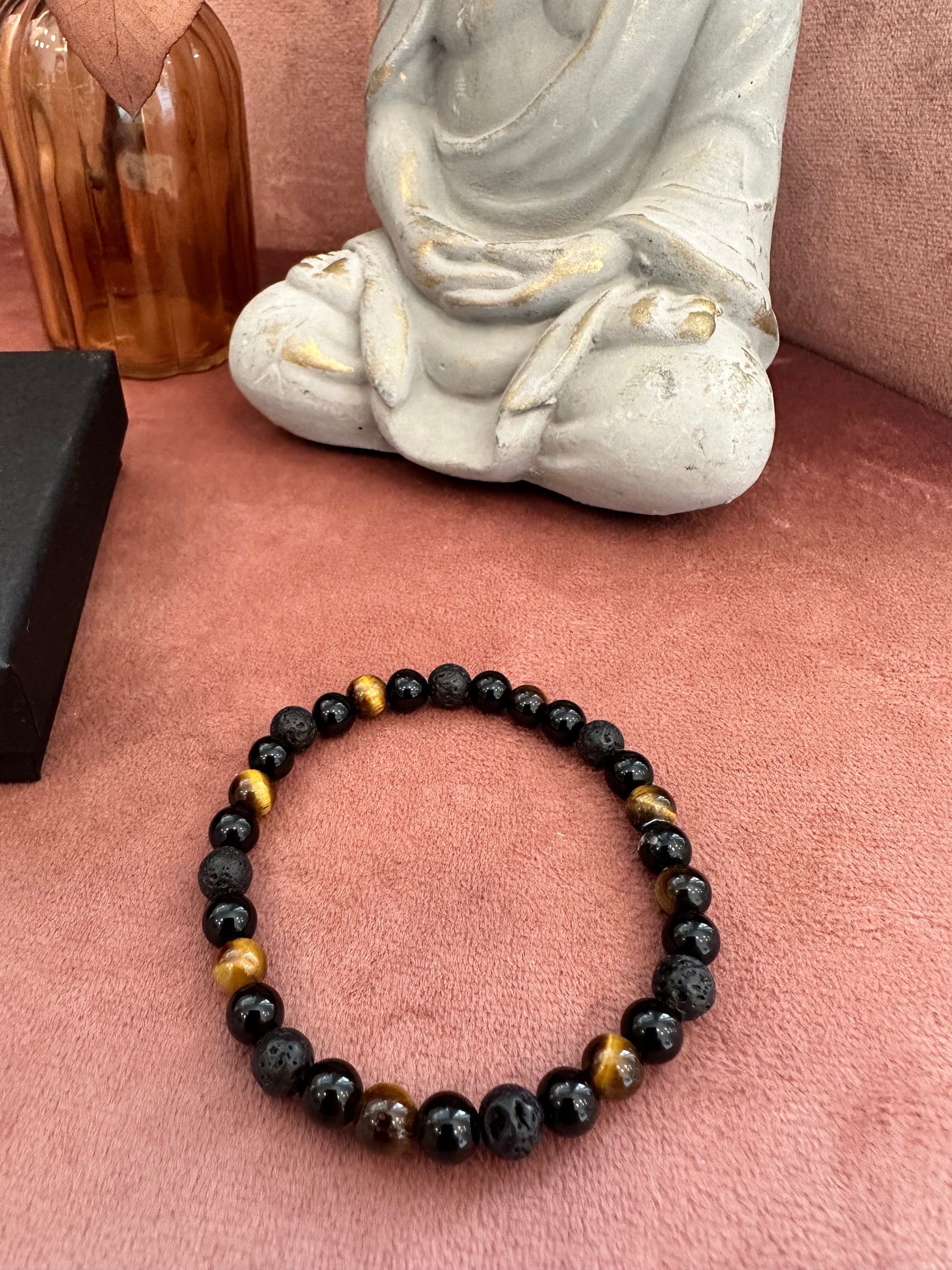 Armbåndet er lavet af: Tigerøje, Sort Obsidian & Lava.